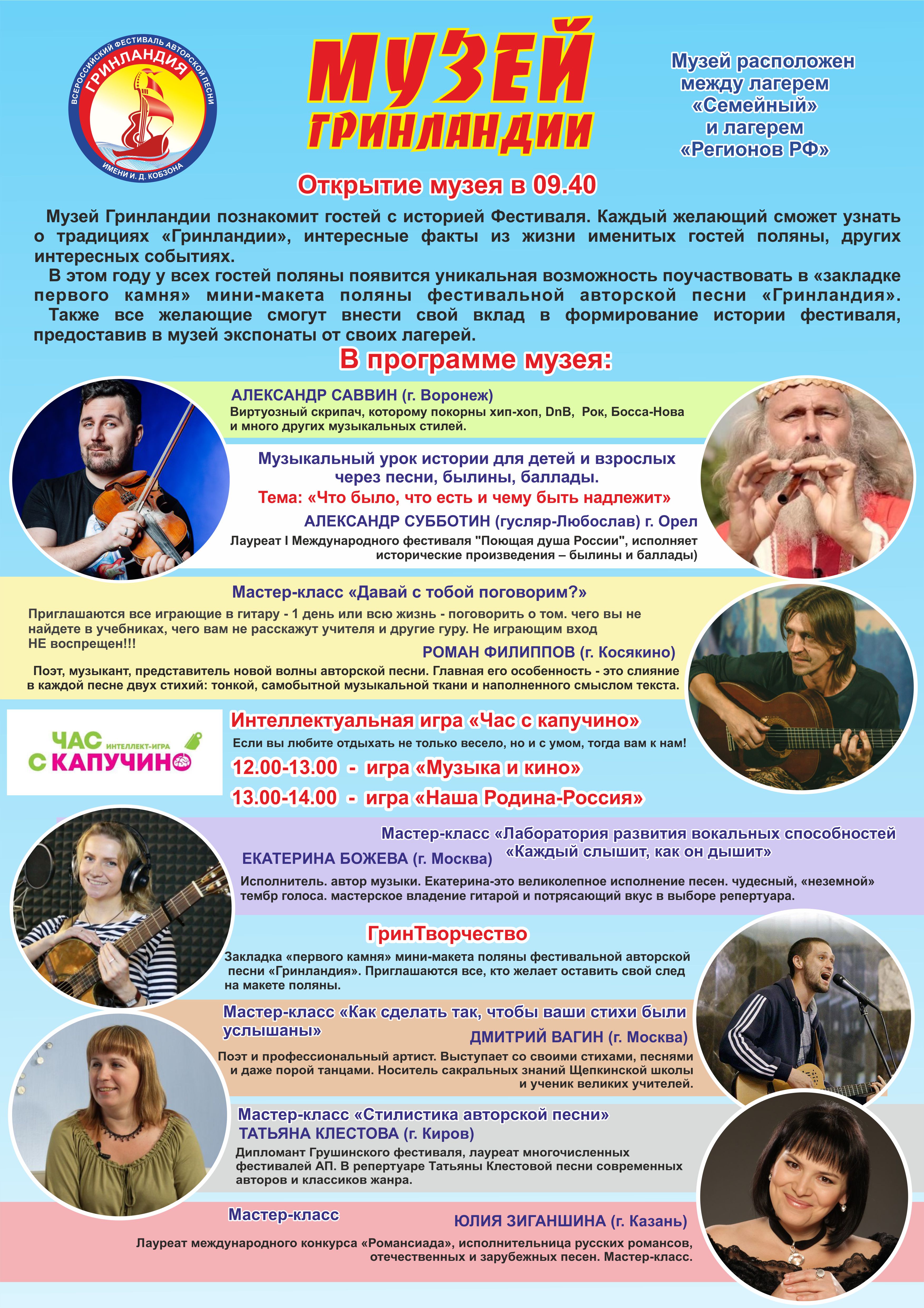 В 2019 году на базе музея Гринландии будет создан макет поляны фестиваля авторской песни «Гринландия». У всех гостей поляны появится уникальная возможность поучаствовать в «закладке первого камня», разместив на данном макете часть своего лагеря. Обязательным элементом музея станет уютный чайный уголок с ароматными напитками и домашним печеньем!