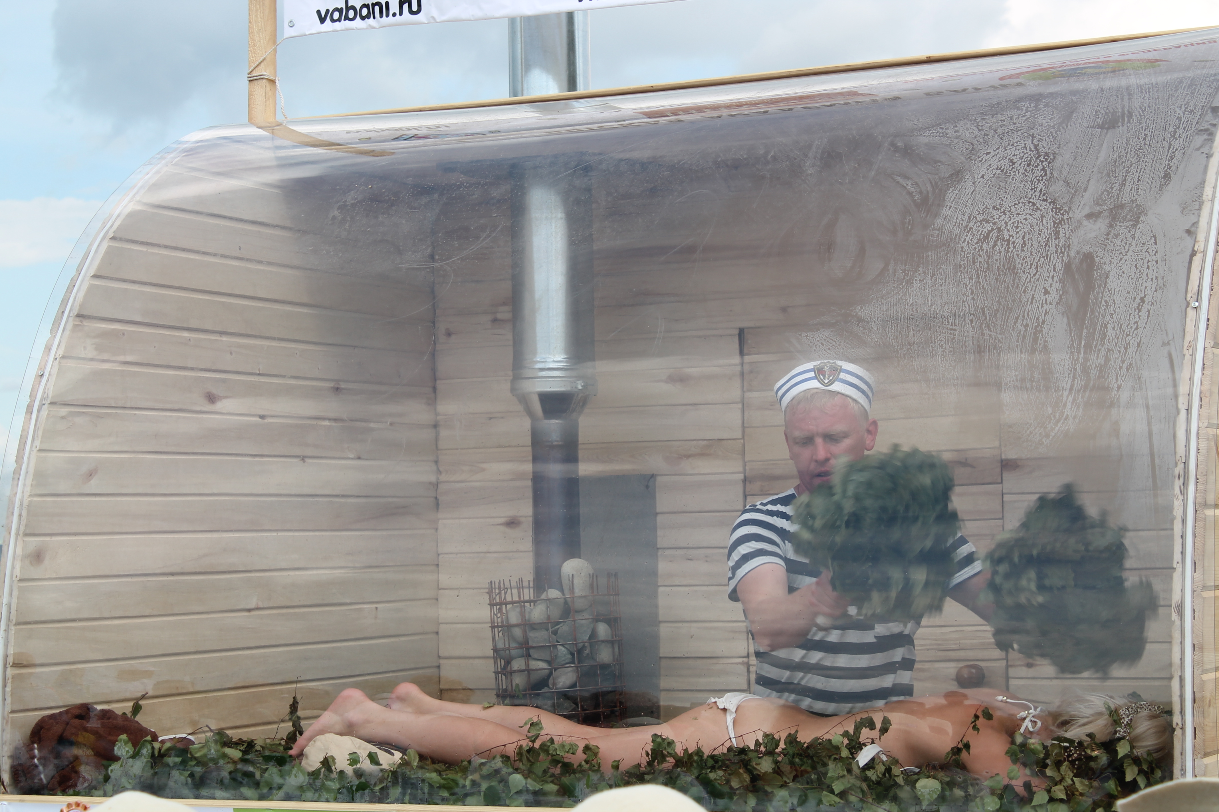 С 12 часов на фестивальной поляне шестеро финалистов Кубка по банному спорту один за другим демонстрируют жюри свое искусство