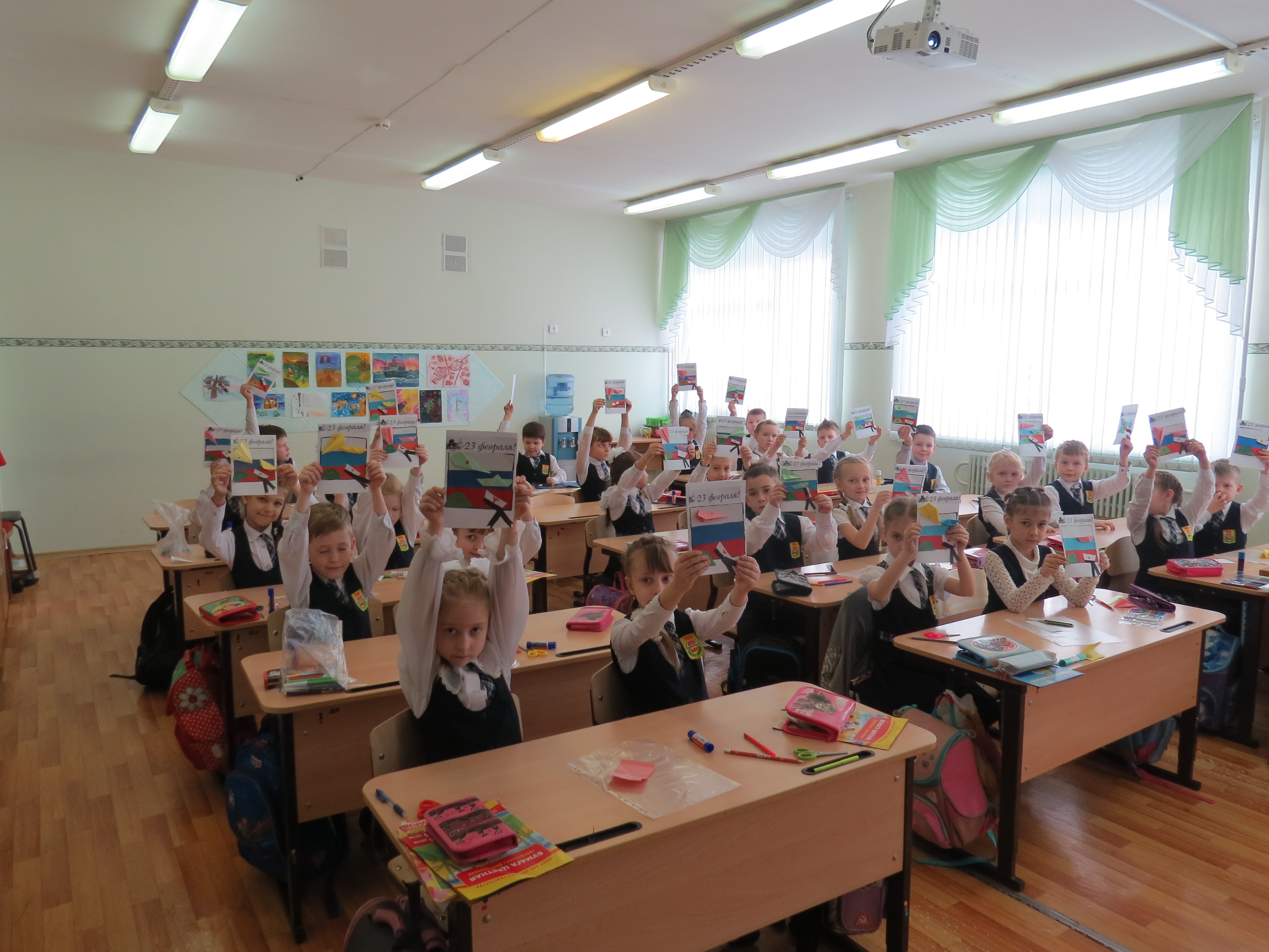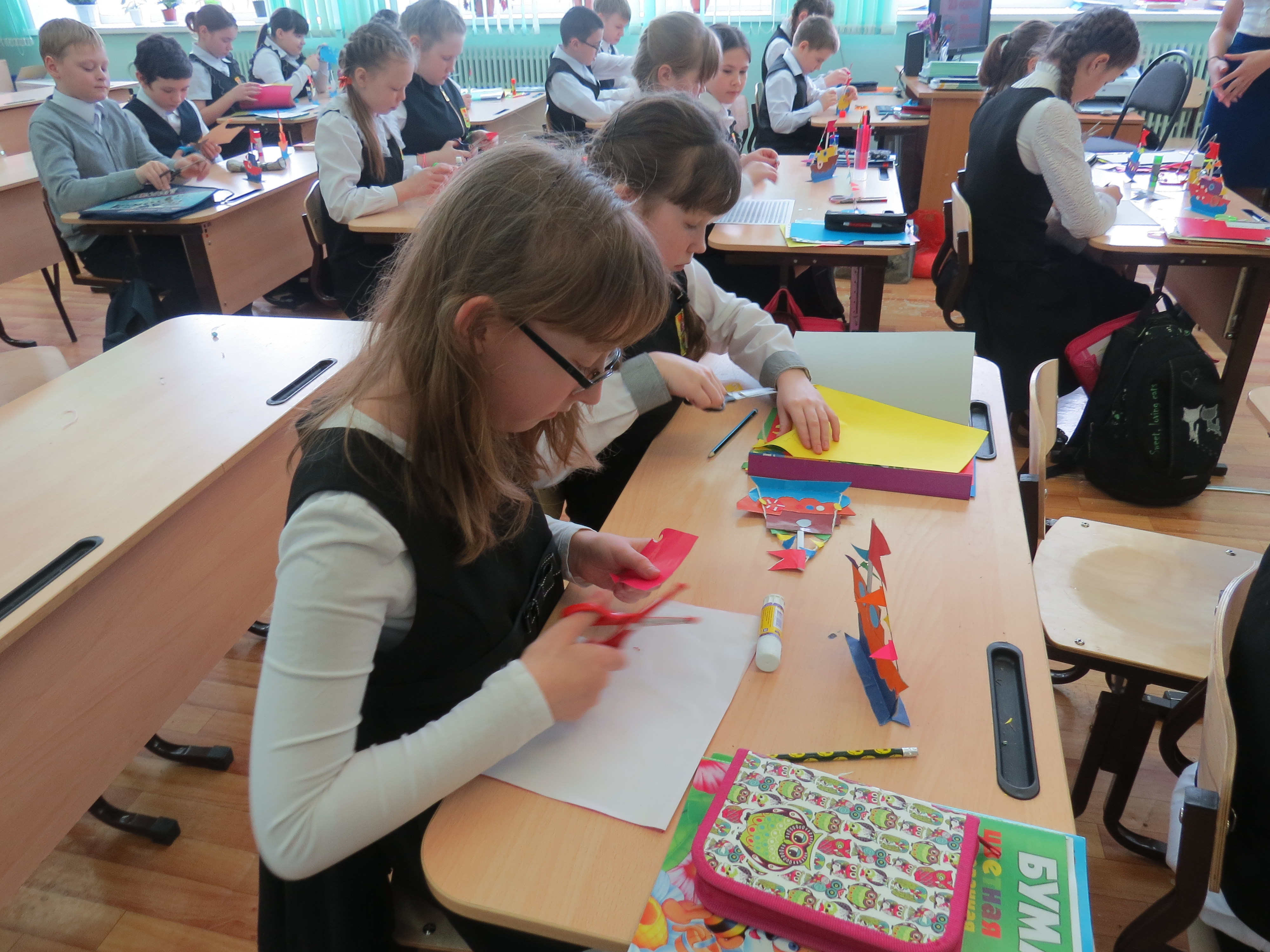 Ребята из четвертого класса делают аппликации. Кто-то подарит их своих отцам, а кто-то сразу решил отправить самодельный корабль посылкой в армию.