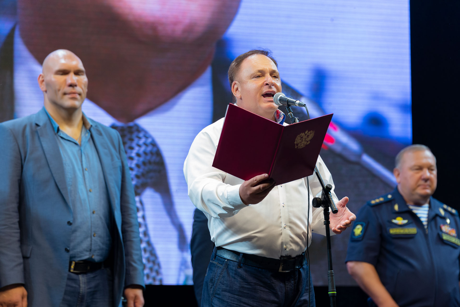 На сцену также поднялись чемпион мира в супертяжелом весе по боксу, посол ГТО Николай Валуев, председатель комитета Госдумы по обороне, генерал-полковник Владимир Шаманов, лётчик-космонавт, председатель РДШ Сергей Рязанский, а также первые лица города и области.