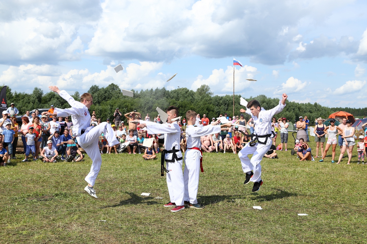 А у малой сцены после бодрой зарядки состоялись показательные выступления тхэквондистов. Воспитанники кировской школы боевых искусств показали технику тхэквандо, элементы спарринга, разбивали в прыжке доски.